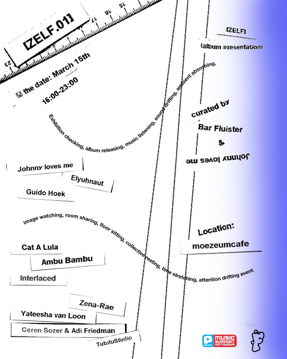 ZELF.01 is een samenwerking tussen Bar Fluister en Johnny loves me, waarin muziek, ambient listening en beeldende kunst samenkomen rond het thema 'zelf'. Het is een uitnodiging om te vertragen, te voelen en te blijven hangen zo lang het resoneert om dat te doen.